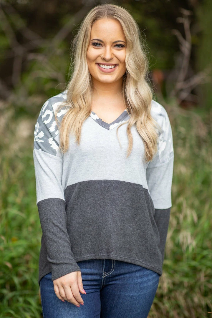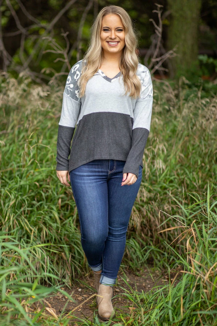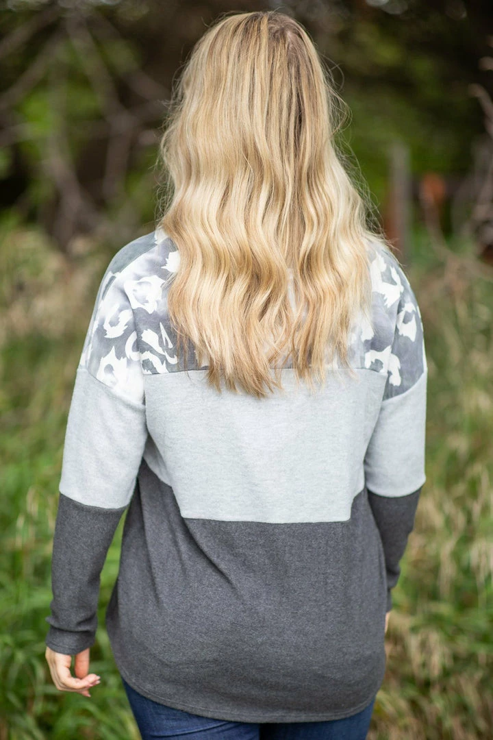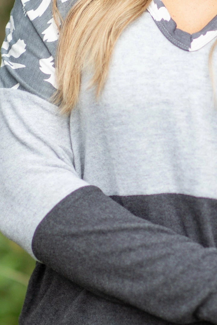 - Other Details: This lightweight hooded top has a tie dye look in different shades of grey with ivory animal print on the hood, collar and top. The colorblocks are a soft brushed knit material.