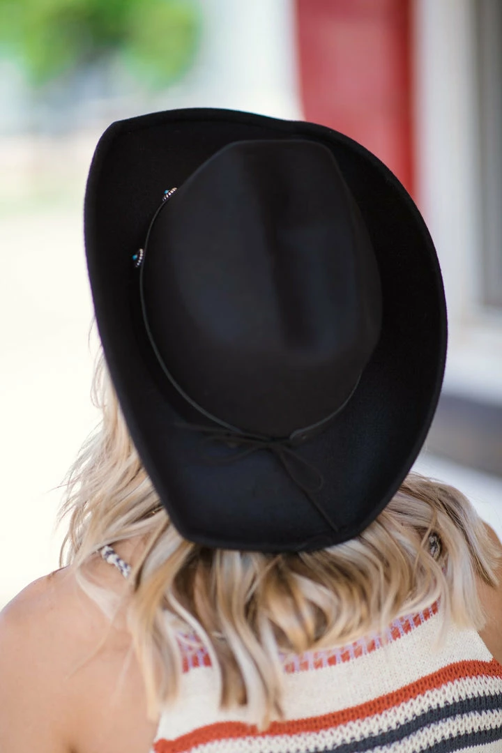 - Other Details: This felted hat has a black band with silver and turquoise embellishments.