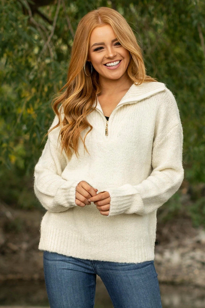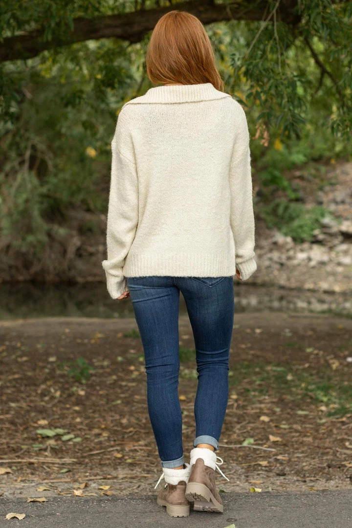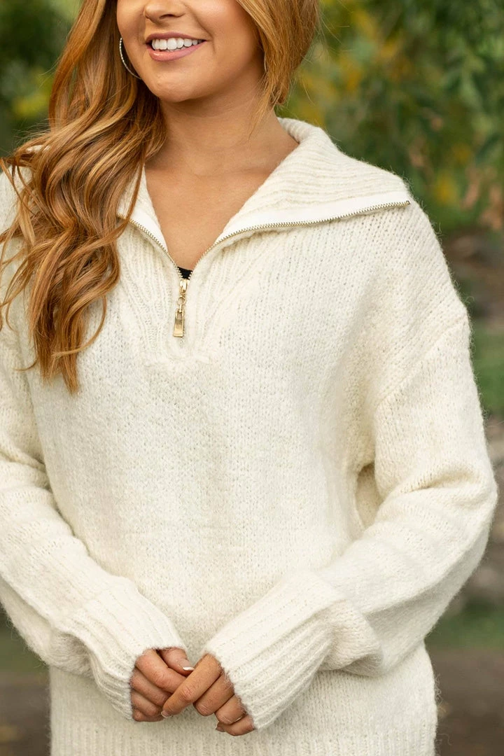 - Other Details: This is a knit sweater with a half zip in gold. There is also a V shape knit detail on the front. The sweater has a soft, almost wool-like feel to it with it’s heavier knit.Â
